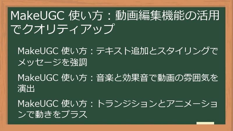 MakeUGCで動画にトランジションやアニメーションを追加することで、動画に動きと視覚的な魅力を加えることができます。