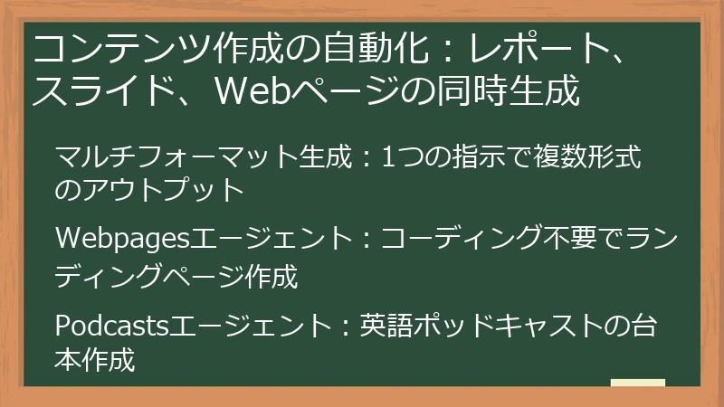 Documents、Slides、Sheets、Webpages、Podcastsという各エージェントは、それぞれ文書作成、プレゼンテーション資料作成、データ分析、ウェブページ生成、ポッドキャスト制作という異なるタスクを効率化するように設計されています。