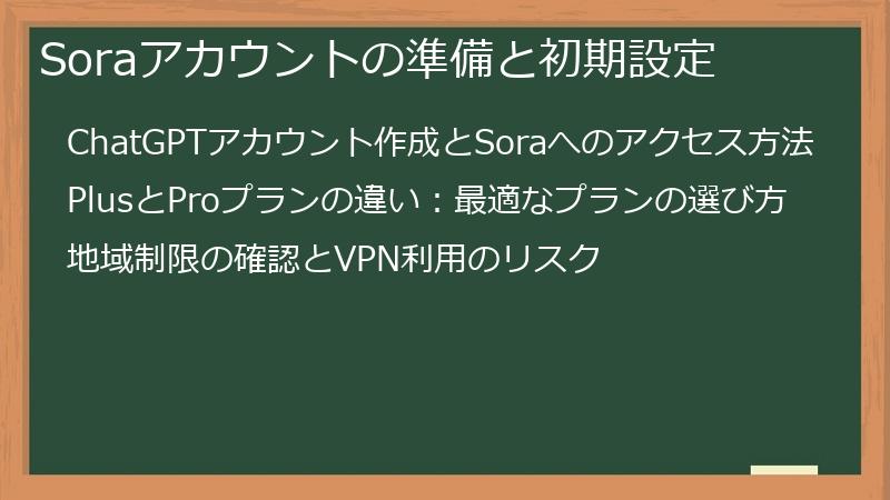 このセクションでは、アカウント作成からSoraへのアクセス、最適なプランの選択、そして地域制限の確認まで、初期設定に必要な手順を詳しく解説します。