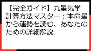 九星気学 【完全ガイド】九星気学 計算方法マスター:本命星から運勢を読む、あなたのための詳細解説 【徹底解説】九星気学の計算方法をマスター!あなたの運勢を読み解く第一歩 九星気学の計算方法について、専門的な知識を求めているあなたへ。 この記事では、あなたの本命星をはじめ、月命星、日命星といった基本的な星の導き出し方から、年盤・月盤・日盤... 2025.08.17 九星気学