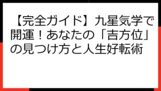 九星気学 【完全ガイド】九星気学で開運!あなたの「吉方位」の見つけ方と人生好転術 【徹底解説】九星気学で人生を好転させる!あなたの最強の「吉方位」の見つけ方と活用術 九星気学という古来より伝わる占術をご存知でしょうか。 この占術は、あなたの生まれ持った星から、人生における吉凶の方位を導き出すことができます。 本記事では、... 2025.08.17 九星気学