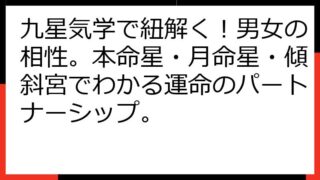 九星気学 九星気学で紐解く!男女の相性。本命星・月命星・傾斜宮でわかる運命のパートナーシップ。 【九星気学で紐解く】男女の相性!運命の出会いと関係性を深める秘訣 九星気学は、古代中国から伝わる占術の一つです。 生年月日から導き出される「九星」は、その人の持つ本質や運命の傾向を表します。 男女の相性を九星気学で読み解くことで、お互いの性... 2025.08.17 九星気学