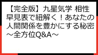 九星気学 【完全版】九星気学 相性早見表で紐解く!あなたの人間関係を豊かにする秘密~全方位Q&A~ 【完全版】九星気学 相性早見表でみる、あなたとあの人の運命の糸 ~人間関係を円滑にする秘密~ 九星気学の相性早見表に興味をお持ちのあなたへ。 この記事では、九星気学の専門的な知識に基づき、あなたとあの人の運命の糸を紐解くための、詳細な相性早... 2025.08.17 九星気学