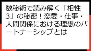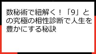 数秘術 数秘術で紐解く!「9」との究極の相性診断で人生を豊かにする秘訣 数秘術で紐解く!人生を豊かにする「9」との究極の相性診断 数秘術の世界へようこそ。 この記事では、人生に深い影響を与える「9」という数字に焦点を当て、あなたとその「9」との相性を徹底的に解き明かしていきます。 「9」という数字が持つ本質的な... 2025.08.17 数秘術