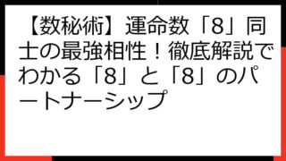 数秘術 【数秘術】運命数「8」同士の最強相性!徹底解説でわかる「8」と「8」のパートナーシップ 【数秘術】「8」と「8」の数字が織りなす、最強のパートナーシップ~相性診断を徹底解説! 数秘術の世界へようこそ。. このページでは、あなたの人生に欠かせないパートナーとの相性を、数字の力で深く読み解いていきます。. 特に、運命数「8」を持つ... 2025.08.17 数秘術