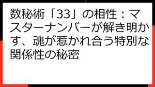 数秘術 数秘術「33」の相性:マスターナンバーが解き明かす、魂が惹かれ合う特別な関係性の秘密 数秘術における「33」の相性:マスターナンバーが織りなす特別な関係性の深層 数秘術の世界で、ひときわ特別な輝きを放つマスターナンバー「33」。 もしあなたが、この「33」という数字に導かれ、誰かとの特別な繋がりを感じているなら、この記事はき... 2025.08.17 数秘術