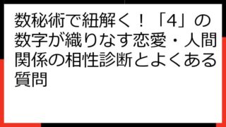 数秘術 数秘術で紐解く!「4」の数字が織りなす恋愛・人間関係の相性診断とよくある質問 数秘術で紐解く!「4」の数字が織りなす恋愛・人間関係の相性診断 数秘術の世界へようこそ。 あなたが「4」という数字に興味を持っているのは、おそらく、身近な人との関係性や、ご自身の恋愛観について、もっと深く知りたいと思っているからでしょう。 ... 2025.08.17 数秘術