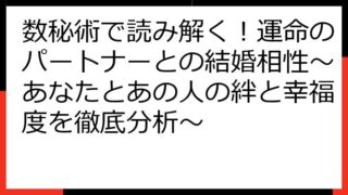 数秘術 数秘術で読み解く!運命のパートナーとの結婚相性~あなたとあの人の絆と幸福度を徹底分析~ 数秘術で解き明かす!運命のパートナーとの結婚相性診断~あなたとあの人の結婚観・幸福度を徹底分析~ 数秘術の世界へようこそ。 あなたは、運命のパートナーと巡り合い、幸せな結婚生活を送りたいと願っていますか? この記事では、数秘術の深遠な知識を... 2025.08.17 数秘術