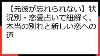 復縁占い・復縁相談 【元彼が忘れられない】状況別・恋愛占いで紐解く、本当の別れと新しい恋への道 【元彼を忘れられないあなたへ】状況別・恋愛占いで紐解く、本当の別れと新しい恋への道 元彼との別れは、とても辛いものですよね。 ふとした瞬間に、楽しかった思い出が蘇ってきて、胸が締め付けられることも。 「どうしても彼を忘れられない…」 そんな... 2025.08.24 復縁占い・復縁相談