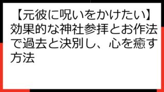 復縁占い・復縁相談 【元彼に呪いをかけたい】効果的な神社参拝とお作法で過去と決別し、心を癒す方法 【元彼に復讐】呪いたい気持ちを鎮める!効果的な神社参拝とお作法 元彼への憎しみや呪いの気持ちで、夜も眠れないほど苦しい思いをしていませんか。 その辛い感情、一人で抱え込まずに、神社参拝で昇華させていきましょう。 この記事では、元彼への呪いの... 2025.08.23 復縁占い・復縁相談