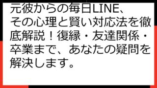 復縁占い・復縁相談 元彼からの毎日LINE、その心理と賢い対応法を徹底解説!復縁・友達関係・卒業まで、あなたの疑問を解決します。 元彼からの毎日LINE!その心理と、あなたが取るべき賢い対応とは? 元彼からのLINEが毎日届く… そんな状況に、あなたは戸惑いや期待、あるいは不安を感じているかもしれません。 「なぜ毎日LINEが来るのだろう?」 「これは復縁を期待しても... 2025.08.23 復縁占い・復縁相談