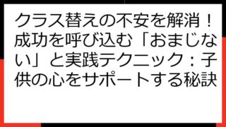 おまじない(御呪い) クラス替えの不安を解消!成功を呼び込む「おまじない」と実践テクニック:子供の心をサポートする秘訣 クラス替えの不安を解消!成功を呼び込む「おまじない」と実践テクニック 新しいクラス、新しい仲間。 クラス替えの時期は、期待とともにちょっぴりの不安もつきまといますよね。 そんな時、ちょっとした「おまじない」が心の支えになってくれることも。 ... 2025.08.22 おまじない(御呪い)