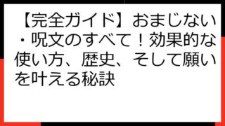 おまじない(御呪い) 【完全ガイド】おまじない・呪文のすべて!効果的な使い方、歴史、そして願いを叶える秘訣 【魔法の言葉】おまじない・呪文のすべて!効果的な使い方から歴史まで徹底解説 古くから伝わる「おまじない」や「呪文」。 これらの言葉には、私たちの願いを叶え、日常に彩りを与えてくれる不思議な力が宿っています。 この記事では、おまじない・呪文の... 2025.08.22 おまじない(御呪い)