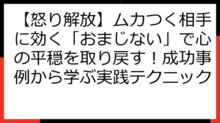 おまじない(御呪い) 【怒り解放】ムカつく相手に効く「おまじない」で心の平穏を取り戻す!成功事例から学ぶ実践テクニック 【怒り解放】ムカつく相手を黙らせる「おまじない」の秘奥義!今日からあなたも心の平穏を取り戻す! あなたが「ムカつく」と感じる相手に、どのように対処していますか? 感情に任せて言い返したり、我慢してストレスを溜め込んだりしていませんか? 実は... 2025.08.22 おまじない(御呪い)