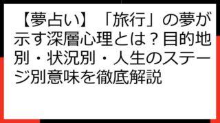 夢占い 【夢占い】「旅行」の夢が示す深層心理とは?目的地別・状況別・人生のステージ別意味を徹底解説 【夢占い】「旅行」の夢が示す深層心理とは?目的地別・状況別の意味を徹底解説 旅行の夢は、あなたの人生における変化や新しい始まりを告げる、非常にパワフルなメッセージを秘めています。 この夢を見たとき、あなたはどのような心理状態にいるのでしょう... 2025.08.22 夢占い