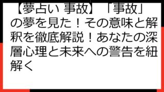 夢占い 【夢占い 事故】「事故」の夢を見た!その意味と解釈を徹底解説!あなたの深層心理と未来への警告を紐解く 【夢占い】「事故」の夢を見た!その意味と解釈を徹底解説! 「事故」という、一見不吉な出来事が夢に現れると、不安な気持ちになるかもしれません。 しかし、夢占いでは、事故の夢は単なる警告だけでなく、あなたの深層心理からのメッセージや、意外な幸運... 2025.08.22 夢占い