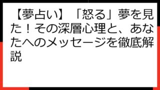 夢占い 【夢占い】「怒る」夢を見た!その深層心理と、あなたへのメッセージを徹底解説 【夢占い】「怒る」夢を見た!その深層心理と、あなたへのメッセージを徹底解説 夢の中での「怒り」は、単なるネガティブな感情の表れだけではありません。 それは、あなたの内面に隠された強い欲求や、現実世界での人間関係、そしてあなた自身へのメッセー... 2025.08.22 夢占い