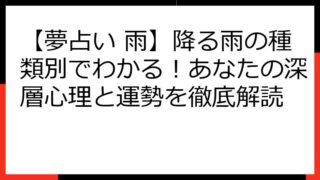 夢占い 【夢占い 雨】降る雨の種類別でわかる!あなたの深層心理と運勢を徹底解読 【夢占い】雨の夢は吉兆?それとも警告?あなたの深層心理を徹底解析! 雨の夢を見たことはありますか? 空から降り注ぐ雨は、私たちの感情や状況に深く関係していると言われています。 この記事では、雨の夢が示す様々な意味を、あなたの深層心理に寄り添... 2025.08.22 夢占い