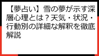 夢占い 【夢占い】雪の夢が示す深層心理とは?天気・状況・行動別の詳細な解釈を徹底解説 【夢占い】雪の夢が示す深層心理とは?天気・状況別の詳細な解釈を徹底解説 雪の夢を見たことはありますか。 雪は、私たちの深層心理に多くのメッセージを伝えてくれる象徴です。 この記事では、雪の夢が持つ基本的な意味から、天気や状況、関わる人物によ... 2025.08.22 夢占い