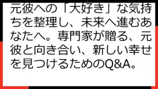 復縁占い・復縁相談 元彼への「大好き」な気持ちを整理し、未来へ進むあなたへ。専門家が贈る、元彼と向き合い、新しい幸せを見つけるためのQ&A。 【元彼が忘れられない】「大好き」な気持ちを抱えるあなたへ贈る、心に寄り添う専門的アドバイス 元彼への「大好き」という気持ち。 それは、ときに甘く、ときに切ない、複雑な感情ですよね。 もしあなたが今、そんな気持ちで胸がいっぱいなら、この記事は... 2025.08.22 復縁占い・復縁相談