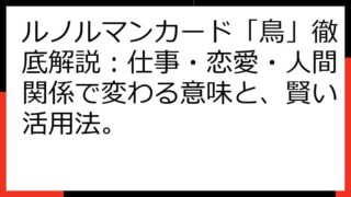 ルノルマンカード ルノルマンカード「鳥」徹底解説:仕事・恋愛・人間関係で変わる意味と、賢い活用法。 ルノルマンカード「鳥」徹底解説:恋愛・仕事・人間関係、あらゆる運命を読み解く! ルノルマンカードの「鳥」カードに興味をお持ちなのですね。 このカードは、コミュニケーション、情報、そして活発な交流といった、私たちの日常に深く関わる多くの側面を... 2025.08.21 ルノルマンカード