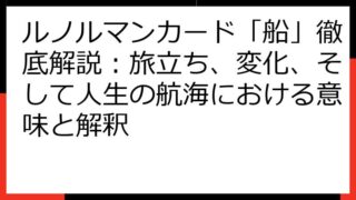 ルノルマンカード ルノルマンカード「船」徹底解説:旅立ち、変化、そして人生の航海における意味と解釈 ルノルマンカード「船」徹底解説:旅立ち、変化、そして潜在的可能性への招待 ルノルマンカードの「船」のカード。 その姿は、あなたの人生における新たな旅の始まりを告げています。 これは単なる移動や旅行を意味するだけではありません。 より深く、あ... 2025.08.21 ルノルマンカード