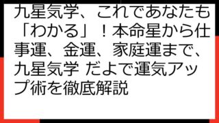 九星気学 九星気学、これであなたも「わかる」!本命星から仕事運、金運、家庭運まで、九星気学 だよで運気アップ術を徹底解説 九星気学、これであなたも「わかる」!今日からできる運気アップ術 九星気学に興味をお持ちですか? でも、何から始めれば良いのか分からない。 そんなあなたのために、この記事では九星気学の基本から、日常で実践できる運気アップの方法まで、分かりやす... 2025.08.21 九星気学