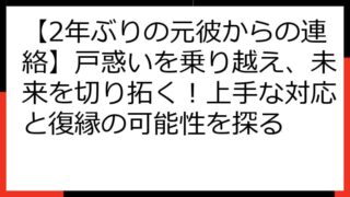 復縁占い・復縁相談 【2年ぶりの元彼からの連絡】戸惑いを乗り越え、未来を切り拓く!上手な対応と復縁の可能性を探る 【2年ぶりの元彼からの連絡】戸惑いを乗り越える!心境整理と上手な対応策 2年ぶりに元彼から連絡が来た。 突然の出来事に、あなたもきっと驚き、戸惑っていることでしょう。 一体なぜ今になって連絡が来たのか、どう返信したらいいのか、そして、この連... 2025.08.21 復縁占い・復縁相談