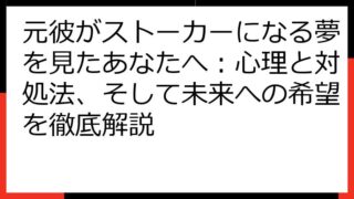 復縁占い・復縁相談 元彼がストーカーになる夢を見たあなたへ:心理と対処法、そして未来への希望を徹底解説 元彼がストーカーになる夢を見たあなたへ:心理と対処法を徹底解説 元彼がストーカーになって追いかけてくる夢を見たことはありませんか?。 その夢は、単なる悪夢かもしれませんし、あなた自身の心の奥底からのメッセージかもしれません。 この記事では、... 2025.08.21 復縁占い・復縁相談