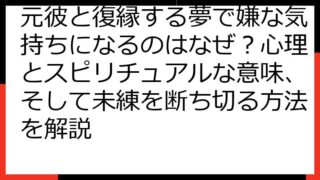 復縁占い・復縁相談 元彼と復縁する夢で嫌な気持ちになるのはなぜ?心理とスピリチュアルな意味、そして未練を断ち切る方法を解説 元彼と復縁する夢で嫌な気持ち…その心理とスピリチュアルな意味を徹底解説 元彼との復縁を夢見て、目覚めた後に嫌な気持ちになった経験はありませんか? それは単なる偶然でしょうか。 それとも、あなた自身の深層心理からのメッセージなのでしょうか。 ... 2025.08.21 復縁占い・復縁相談