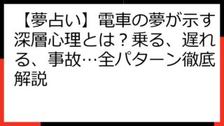 夢占い 【夢占い】電車の夢が示す深層心理とは?乗る、遅れる、事故…全パターン徹底解説 【夢占い】電車の夢が示す深層心理とは?乗る、遅れる、事故…全パターン徹底解説 電車の夢を見たことはありますか? 夢の中の電車は、あなたの人生の進行状況や、これからの進路、人間関係など、様々なメッセージを伝えています。 この記事では、夢占いに... 2025.08.19 夢占い