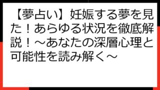 夢占い 【夢占い】妊娠する夢を見た!あらゆる状況を徹底解説!~あなたの深層心理と可能性を読み解く~ 【夢占い】妊娠する夢を見た!その意味とは?あらゆる状況を徹底解説! あなたが「妊娠する夢」を見たとき、それは単なる偶然でしょうか。 それとも、あなたの深層心理からの重要なメッセージが隠されているのでしょうか。 この夢は、新しい生命の誕生を意... 2025.08.19 夢占い