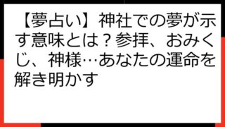 夢占い 【夢占い】神社での夢が示す意味とは?参拝、おみくじ、神様…あなたの運命を解き明かす 【夢占い】神聖な神社での夢が示す意味とは?あなたの運命を解き明かす 神社での夢は、あなたの心の状態や、これから訪れる出来事への無意識のメッセージを伝えていることがあります。 古来より神聖な場所とされる神社にまつわる夢は、どのような意味を持つ... 2025.08.19 夢占い