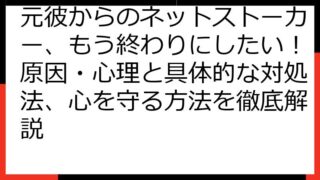 復縁占い・復縁相談 元彼からのネットストーカー、もう終わりにしたい!原因・心理と具体的な対処法、心を守る方法を徹底解説 元彼からのネットストーカー、もう終わりにしたい!対処法と心を守る方法 元彼からのネットストーカー行為に悩んでいませんか。 SNSでの監視や執拗なメッセージ、プライベートへの干渉など、その行為はあなたの心を深く傷つけているかもしれません。 こ... 2025.08.24 復縁占い・復縁相談