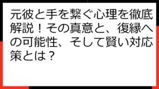 復縁占い・復縁相談 元彼と手を繋ぐ心理を徹底解説!その真意と、復縁への可能性、そして賢い対応策とは? 【元彼と手を繋ぐ心理】なぜ?その意図と行動から読み解く、再燃の可能性と対処法 元彼と、ふとした瞬間に手を繋いでしまった。 そんな経験はありませんか? それは単なる偶然なのでしょうか。 それとも、彼の中にまだあなたへの想いが残っているサインな... 2025.08.24 復縁占い・復縁相談