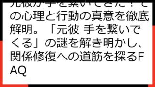復縁占い・復縁相談 元彼が手を繋いできた!その心理と行動の真意を徹底解明。「元彼 手を繋いでくる」の謎を解き明かし、関係修復への道筋を探るFAQ 元彼が手を繋いできた!その心理と、あなたの取るべき最善の行動とは? 元彼が、ふと手を繋いできた…。 その突然の出来事に、あなたは戸惑いや期待、様々な感情を抱いているのではないでしょうか。 それは、単なる気まぐれなのか、それとも復縁へのサイン... 2025.08.24 復縁占い・復縁相談