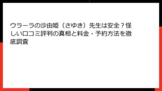 ウラーラ ウラーラの沙由姫(さゆき)先生は安全?怪しい口コミ評判の真相と料金・予約方法を徹底調査 ウラーラ所属の人気占い師・沙由姫(さゆき)さんの魅力と鑑定ガイド こんにちは、占い好きの皆さん! 今日は、チャット占いアプリ「ウラーラ」で活躍する注目の占い師、沙由姫(さゆき)さんについて深掘りしていきましょう。沙由姫さんは、霊感の強さと優... 2025.09.09 ウラーラ
