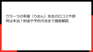 ウラーラ ウラーラの莉音(りおん)先生の口コミや評判は本当?料金や予約方法まで徹底解説 ウラーラ所属の人気占い師・莉音先生の魅力に迫る!得意分野から鑑定方法まで徹底解説 こんにちは、占い好きの皆さん! 今日は、チャット占いアプリ「ウラーラ」で大人気の占い師、莉音(りおん)先生について、詳しくお話ししていきたいと思います。ウラー... 2025.09.09 ウラーラ