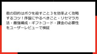 アクション 君の目的はボクを殺すこと3を効率よく攻略するコツ!序盤にやるべきこと・リセマラ方法・最強編成・ギフトコード・課金の必要性をユーザーレビューで検証 『君の目的はボクを殺すこと3』攻略ガイド:ゲーム概要と序盤のポイント・コツ 『君の目的はボクを殺すこと3』(以下、ボク殺3)は、シンプルな操作で楽しめる放置系RPGスマホゲームです。独特な世界観とユーモラスなストーリー、そして爽快な魔神... 2025.09.09 アクション