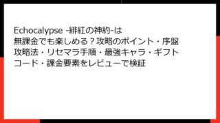 RPG Echocalypse -緋紅の神約-は無課金でも楽しめる?攻略のポイント・序盤攻略法・リセマラ手順・最強キャラ・ギフトコード・課金要素をレビューで検証 Echocalypse -緋紅の神約- 攻略ガイド:ゲーム概要と序盤の進め方 『Echocalypse -緋紅の神約-』(以下、エコカリ)は、獣娘たちと共に終末世界を冒険する策略系RPGスマホゲームです。美しいグラフィック、豪華声優陣、... 2025.09.06 RPGアドベンチャー