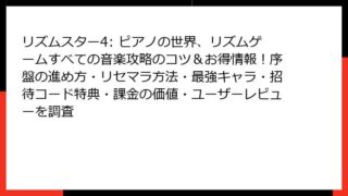 ファミリー リズムスター4: ピアノの世界、リズムゲームすべての音楽攻略のコツ&お得情報!序盤の進め方・リセマラ方法・最強キャラ・招待コード特典・課金の価値・ユーザーレビューを調査 リズムスター4: ピアノの世界を奏でる究極のリズムアドベンチャー 音楽の魔法に満ちた世界へようこそ! スマホアプリ『リズムスター4: ピアノの世界、リズムゲームすべての音楽』は、ピアノの鍵盤を叩くようなシンプルな操作で、ポップからEDM... 2025.09.13 ファミリーミュージック