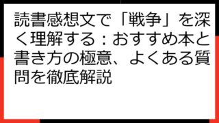 読書感想文 読書感想文で「戦争」を深く理解する:おすすめ本と書き方の極意、よくある質問を徹底解説 読書感想文で「戦争」を深く理解する:おすすめ本と書き方の極意 「戦争」という言葉を聞くと、どのようなイメージが浮かんできますか。 それは、遠い過去の出来事でしょうか。 それとも、今もなお世界各地で続いている現実でしょうか。 読書を通じて、私... 2025.08.20 読書感想文