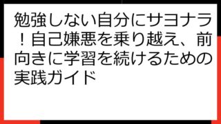勉強嫌い・勉強しない 勉強しない自分にサヨナラ!自己嫌悪を乗り越え、前向きに学習を続けるための実践ガイド 勉強しない自分を責めてしまうあなたへ:自己嫌悪から抜け出し、前向きになるためのロードマップ 「勉強しないと」「やらなければ」という焦りや、それに伴う自己嫌悪の感情に苦しんでいませんか。 「どうして自分はこんなにできないんだろう」と、自分を責... 2025.08.13 勉強嫌い・勉強しない