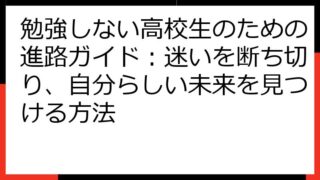 勉強嫌い・勉強しない 勉強しない高校生のための進路ガイド:迷いを断ち切り、自分らしい未来を見つける方法 【勉強しない高校生必見】進路に迷ったら?今からできる具体的なステップと保護者のサポート 「勉強しない」と将来に悩む高校生の皆さん、そしてその保護者の皆様へ。 進路選択は、人生の大きな岐路ですが、焦る必要はありません。 この記事では、勉強に身... 2025.08.14 勉強嫌い・勉強しない