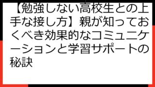 勉強嫌い・勉強しない 【勉強しない高校生との上手な接し方】親が知っておくべき効果的なコミュニケーションと学習サポートの秘訣 【親御さん必見】勉強しない高校生への効果的な接し方:今日からできる具体的なアプローチ 高校生になると、親御さんの多くが「うちの子、勉強しない…」と悩む時期を迎えます。 反抗期とも重なり、どう接したら良いか分からず、焦りや不安を感じることもあ... 2025.08.13 勉強嫌い・勉強しない