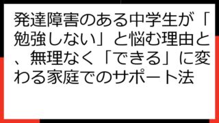 勉強嫌い・勉強しない 発達障害のある中学生が「勉強しない」と悩む理由と、無理なく「できる」に変わる家庭でのサポート法 発達障害のある中学生が「勉強しない」と悩む理由と、無理なく「できる」に変わる家庭でのサポート法 「うちの子、どうして勉強してくれないんだろう?」 「発達障害があるから、勉強が苦手なのかな?」 「親として、どうサポートしたらいいのかわからない... 2025.08.14 勉強嫌い・勉強しない