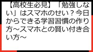 勉強嫌い・勉強しない 【高校生必見】「勉強しない」はスマホのせい?今日からできる学習習慣の作り方~スマホとの賢い付き合い方~ 【高校生必見】「勉強しない」はスマホのせい?今日からできる学習習慣の作り方 「勉強しなきゃ」と思いつつも、ついついスマホを触ってしまう…。 そんな悩みを抱える高校生は、あなただけではありません。 この記事では、スマホとの賢い付き合い方から、... 2025.08.14 勉強嫌い・勉強しない