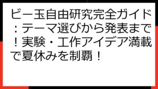 自由研究 ビー玉自由研究完全ガイド:テーマ選びから発表まで!実験・工作アイデア満載で夏休みを制覇! 【完全攻略】自由研究はビー玉で決まり!小学生から大人まで楽しめる実験・工作アイデア集 自由研究のテーマ選び、もう迷う必要はありません! キラキラと輝くビー玉には、無限の可能性が秘められています。 この記事では、小学生から大人まで、誰もが夢中... 2025.08.25 自由研究