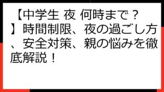 中学生 【中学生 夜 何時まで?】時間制限、夜の過ごし方、安全対策、親の悩みを徹底解説! 【中学生の夜は何時まで?】時間制限の真実と成長を支える過ごし方ガイド 中学生の皆さん、そして保護者の皆様、夜は何時まで起きていていいのか、悩んだことはありませんか? 法律や条例で定められた時間制限、学校や家庭のルール、そして成長に必要な睡眠... 2025.08.25 中学生