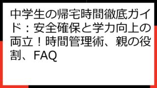 中学生 中学生の帰宅時間徹底ガイド:安全確保と学力向上の両立!時間管理術、親の役割、FAQ 【徹底解説】中学生の理想的な帰宅時間とは?時間管理術から安全対策まで完全ガイド 中学生のお子さんを持つ保護者の皆様、お子さんの帰宅時間について悩んだことはありませんか? 部活動、塾、友達との交流など、中学生の生活は多忙を極めます。 この記事... 2025.08.25 中学生